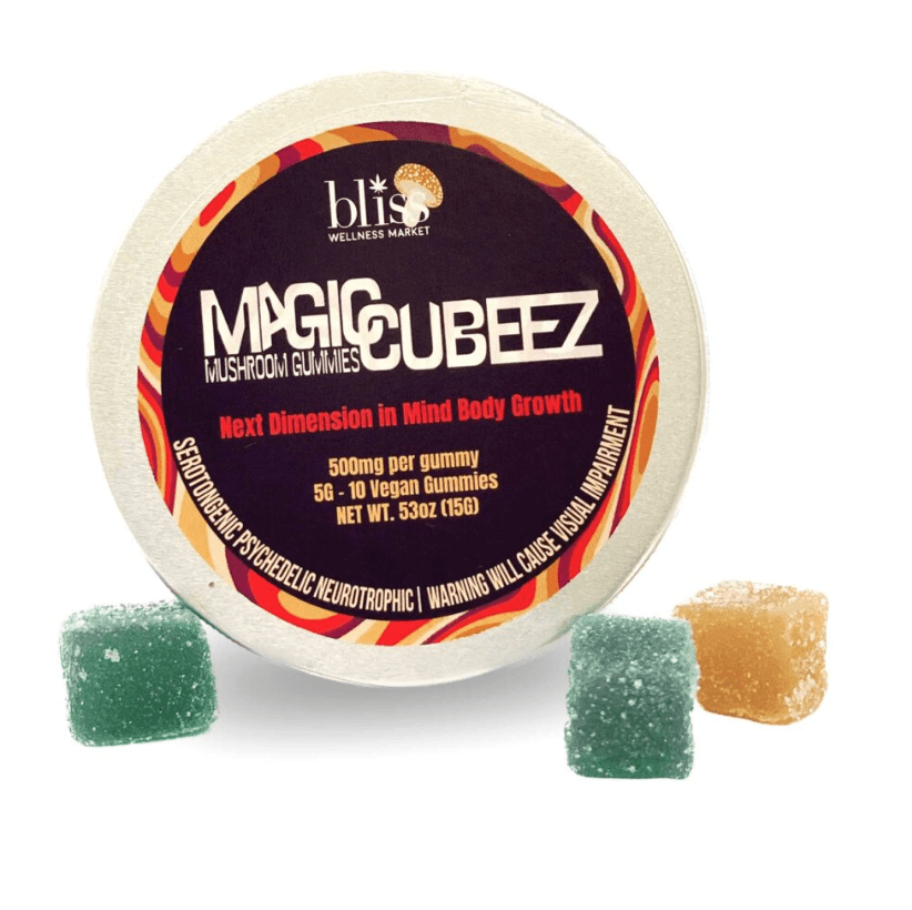 What is Psilocybe Cubensis – “Magic Cubeez”? A species of psychedelic mushroom that has zero psilocybin & psilocin. The mushroom has a distinct appearance with a conical to convex cap, a central or slightly off center stem, and a coloration that can range from white to pale yellow or tan. When consumed, Psilocybe Cubensis can induce altered states of consciousness, hallucinations, and psychedelic experiences. Our Magic Cubeez contains a formula of the mushroom which is measured into exact doses, specially curated for Bliss Wellness Market.